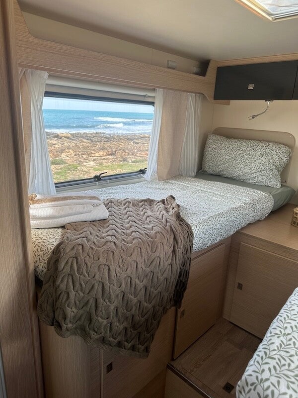 Camper moderno e luminoso, perfetto per coppie o famiglie che cercano comfort e privacy.